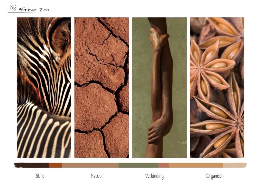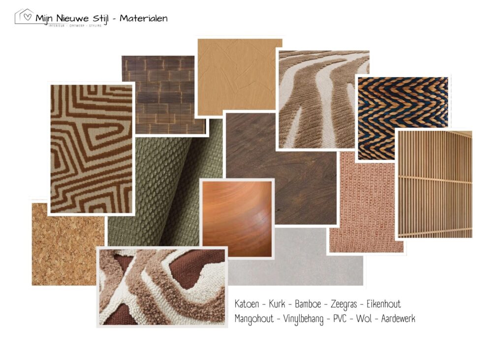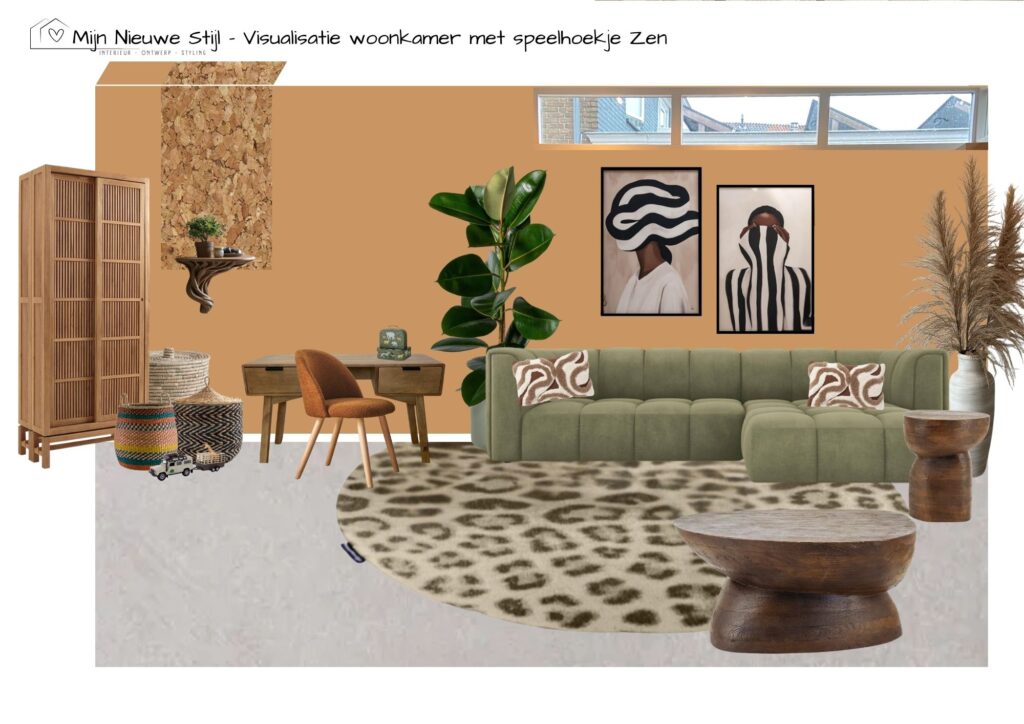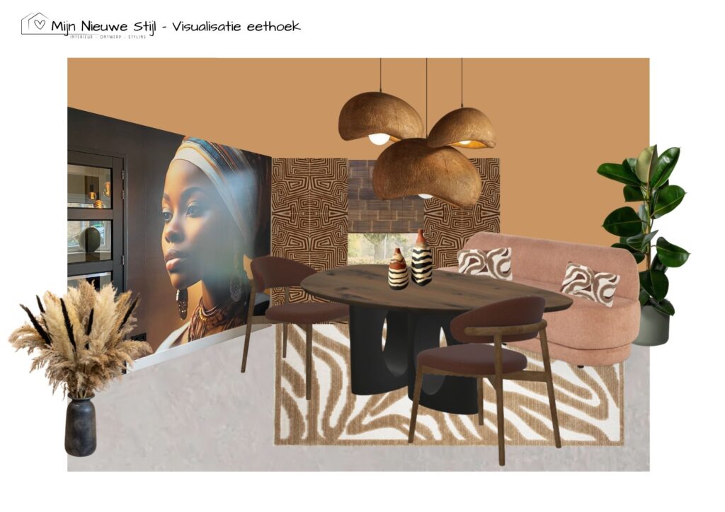 Met die woorden als kompas heb ik een ontwerp gemaakt waarin ritme, natuur en verbinding samenkomen. Warme aardetinten, organische vormen en rijke texturen brengen rust, terwijl patronen en materialen met karakter hun identiteit zichtbaar maken. Het resultaat is een interieur dat niet schreeuwt, maar fluistert, een ruimte die je omarmt zodra je binnenstapt.