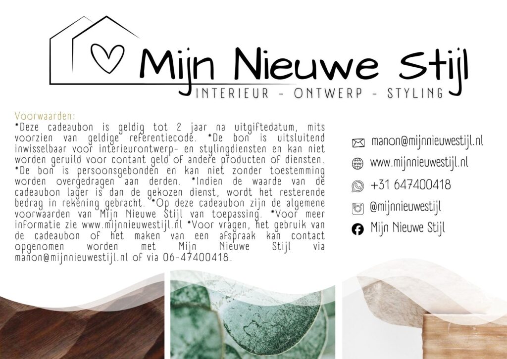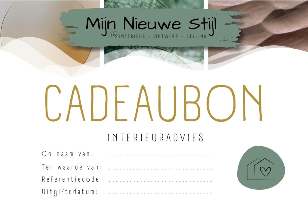 Van moodboard tot kleuradvies, van slimme indeling tot sfeervolle accenten: een cadeaubon van Mijn Nieuwe Stijl is te gebruiken voor al mijn volledige aanbod. Scroll verder naar beneden om online te bestellen.