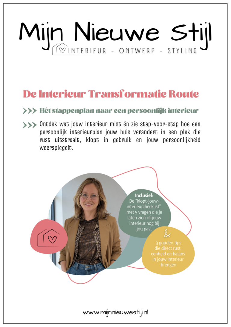 Inclusief de “klopt-jouw-interieur-checklist” met 5 vragen die je laten zien of jouw interieur nog bij jou past & 3 gouden tips die direct rust, eenheid en balans in jouw interieur brengen.