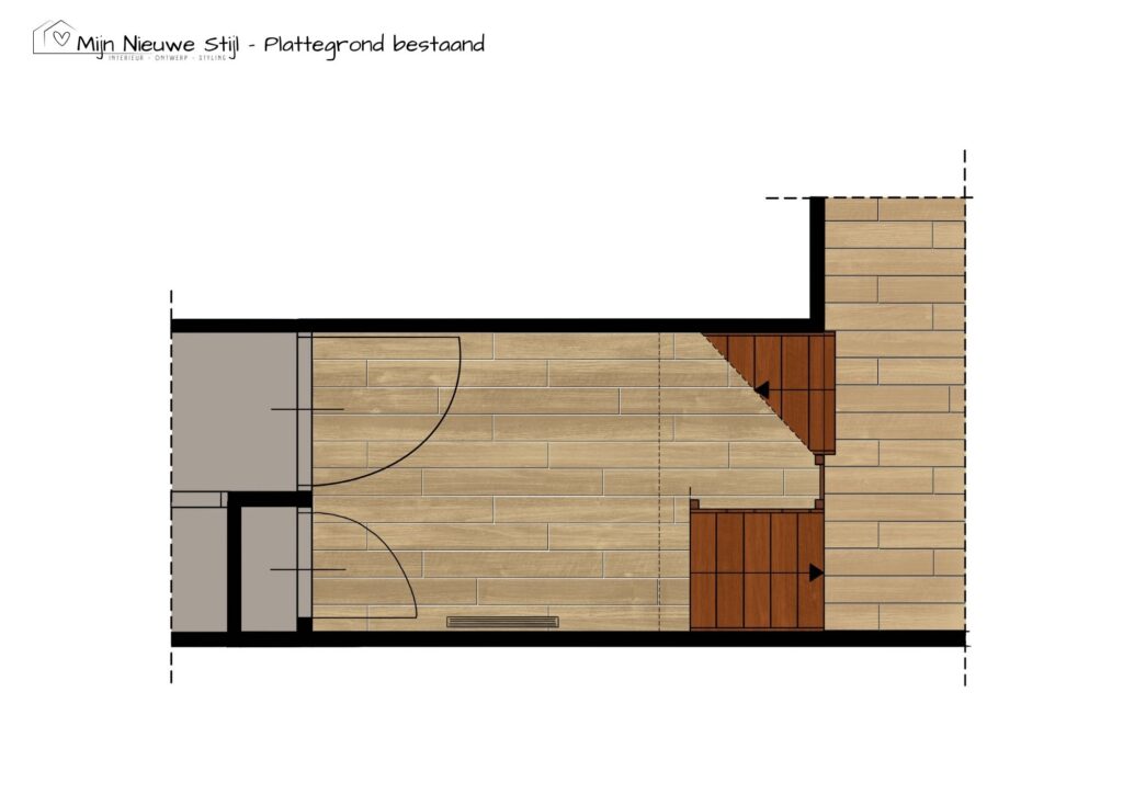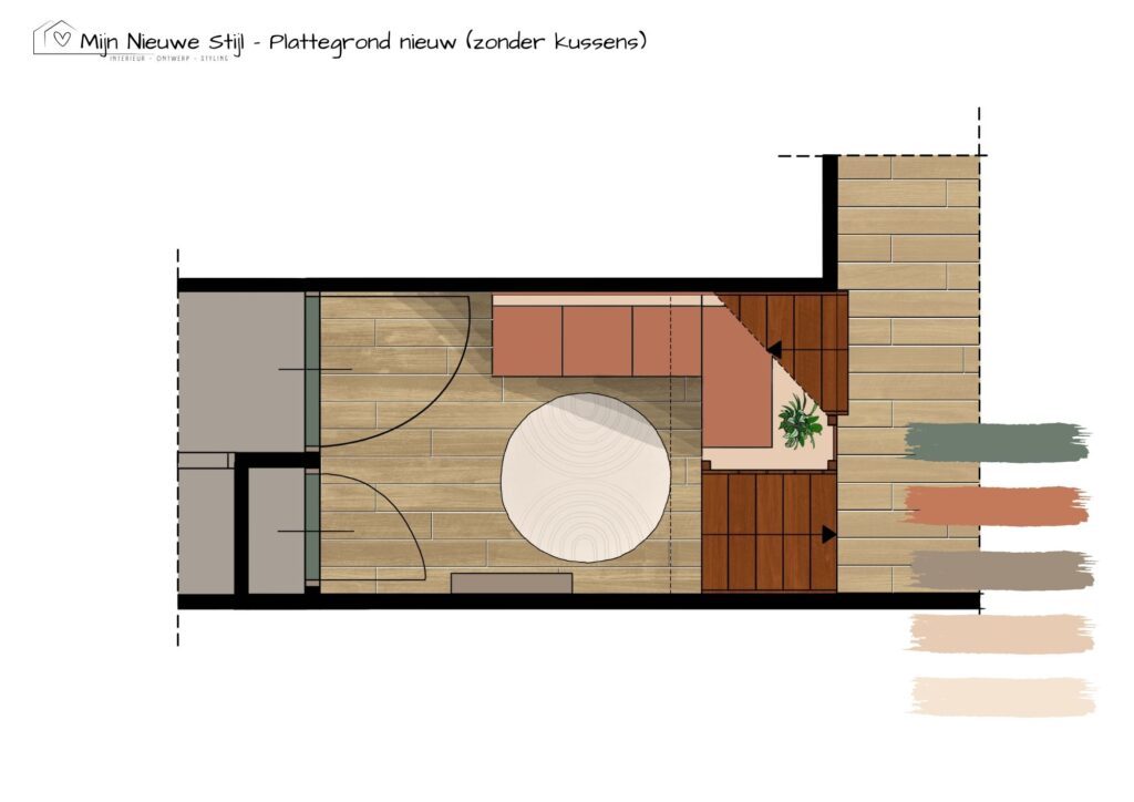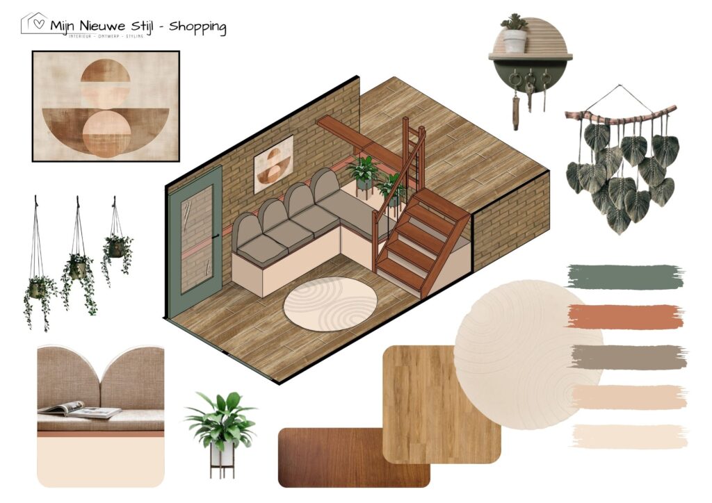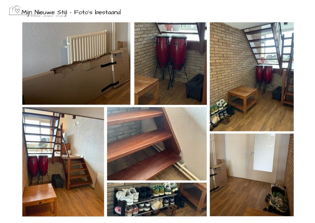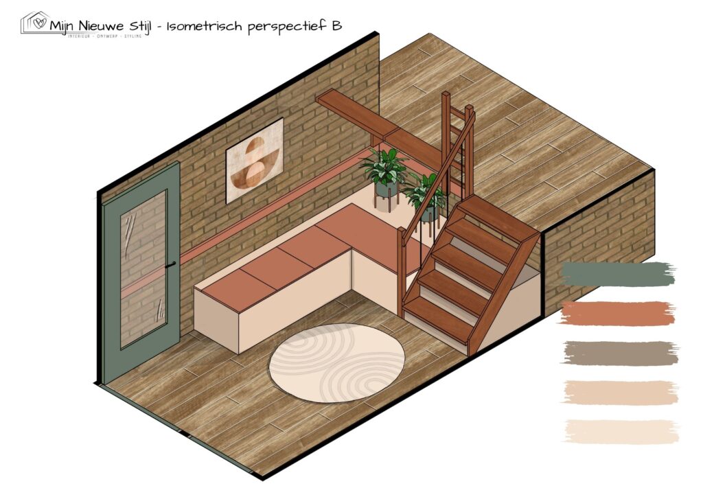 Ik ontwierp een maatwerkmeubel dat precies past bij hun wensen én hun liefde voor natuur. Onder de trap en langs de wand komt een comfortabele hoekbank met zachte kussens. De zittingen kunnen open met gasveren, zodat tassen en schoenen netjes uit het zicht verdwijnen. Ook onder de trap is plek voor seizoensjassen en andere spullen.